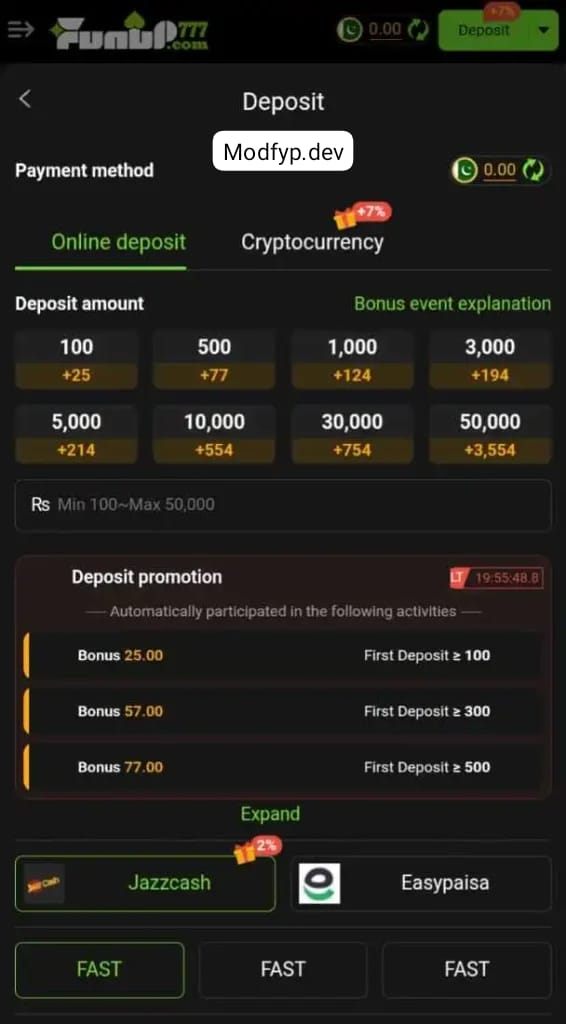 The Funup 777 real money game supports multiple payment methods for deposits and withdrawals. Users can add funds using UPI, bank transfers, debit cards, credit cards, JazzCash and Easypaisa and popular e-wallets. The deposit process is instant, allowing you to start playing immediately after adding money.